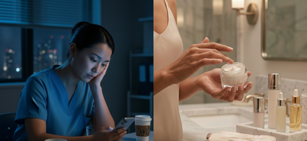 Working nights disrupts your body’s natural circadian rhythm—and your skin feels it. Increased inflammation, dullness, breakouts, dehydration, and premature aging are common concerns for night shift nurses.